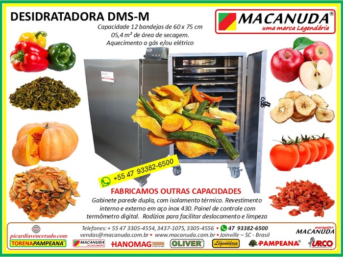 www.macanudavencetudo.com; www.picardiavencetudo.com / Desidratadoras (Estufas, Secadoras) de frutas, peixes, hortaliças, pólen, ervas, chips de coco, queijos,... Gabinete parede dupla, com isolamento térmico em lã de rocha. * Revestimento interno e externo em chapa de aço inox AISI 430. * Termômetro digital. * Turbo para ventilação horizontal entre as bandejas. * Bandejas em aço inox 430, alumínio (chapa expandida) ou tela de nylon ou aço inox. Diversos modelos e capacidades. Aquecimento elétrico, misto (elétrico e gás) ou somente a gás.